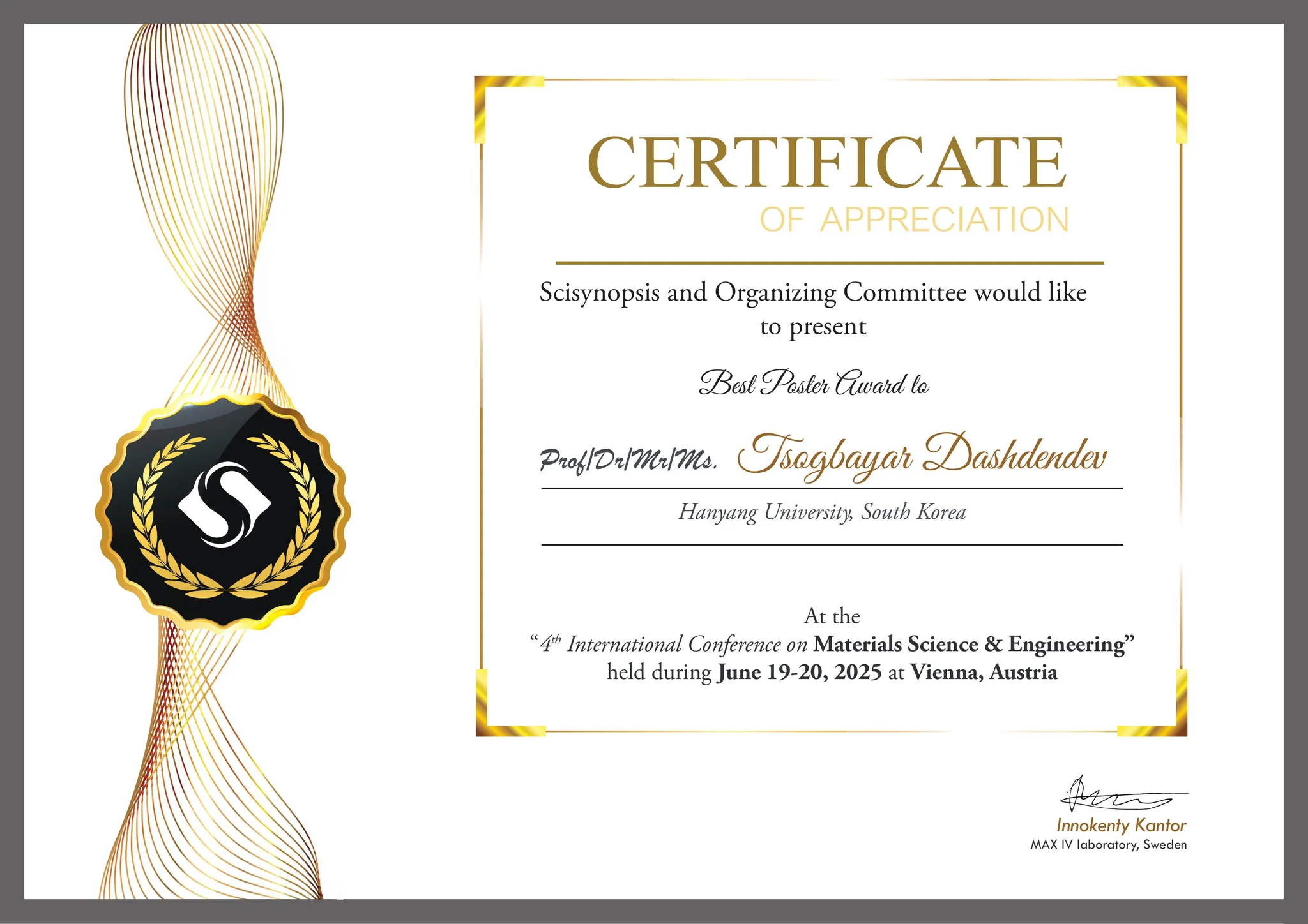 Tsogbayar Dashdendev received the best poster award. (4th International Conference on Materials Science & Engineering, 2025)